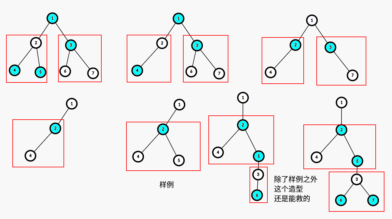 对于孤岛根,一个很好的性质是其儿子所在连通块一定是下面的两层,故大力讨论前三层形态(实际上是前五层):